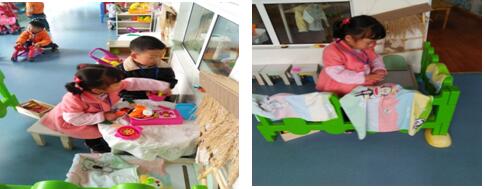 娃娃家还有很多玩法,其实就是孩子生活经验的体现。 教师以角色的身份进入娃娃家,引导孩子想出更多的玩法。 |
